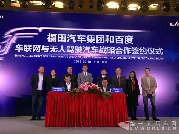 2016年10月10日,福田汽车集团与百度在北京签署战略合作协议。福田汽车集团常务副总经理巩月琼,福田汽车集团副总裁宋术山,福田汽车集团副总裁、工程研究总院院长陈青山等福田汽车集团高层,百度L3事业部商务总经理张磊、中国汽车工业协会副秘书长姚杰以及第一商用车网等媒体代表等出席了会议。